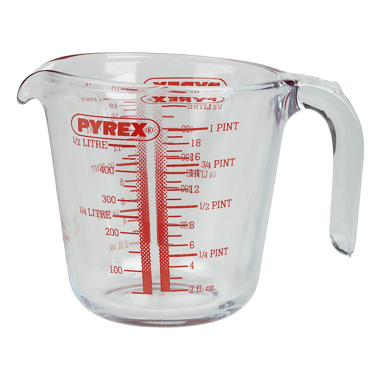Product information. Description. Our new revisted centenary edition of the Pyrex iconic measuring jug. All the same great features of our standard measuring jug plus a printed centenary logo on the side. 0.5L. Borosilicate glass - thermal shock resistant. Safe, hygienic material. Easy to clean. Comes with a 10 year guarantee.